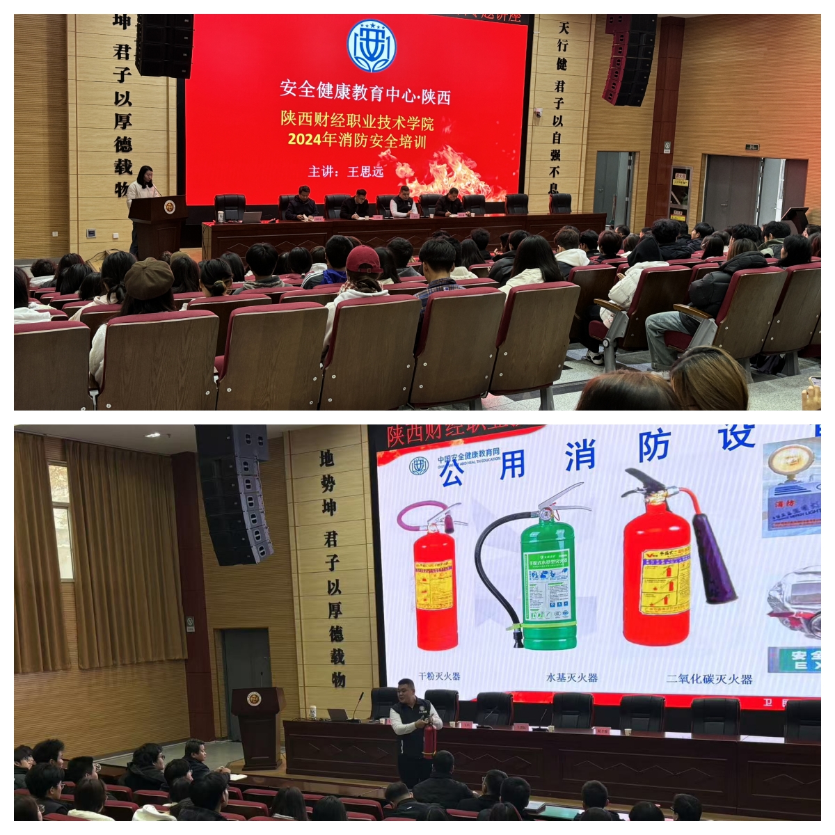 四是开展讲座,强化培训。11月18日。保卫处联合学生处,应急管理学院邀请陕西安全健康教育中心王思远主任到校开展消防安全专题讲座。王主任以丰富的专业知识和实践经验,围绕消防常识、防火技巧、灭火方法及火场逃生策略和灭火器使用要领等多个方面进行了深入讲解和实操演示。他结合生动案例,直观展示火灾发生的常见原因,如电器设备使用不当、易燃物违规存储、人为疏忽等,进一步强化师生对火灾的危害性与预防火灾的重要性认识,激发大家防患于未然的紧迫感和责任感。应急管理学院党支部副书记王华强调,进入11月份后是火灾的高发时期,希望大家广泛学习灭火基本方法、逃生基本技能和防火基本知识,形成“人人受到宣传教育,人人增强防范意识,人人掌握基本常识”的良好局面,把各种消防安全隐患消除在萌芽状态,共创平安和谐校园。