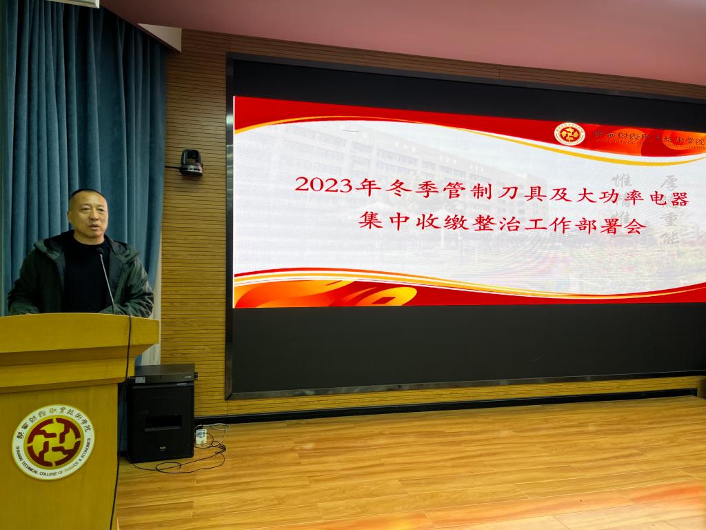 检查开始前,全体人员在继续教育培训厅召开部署动员会,李健兵详细解读2023年冬季管制刀具及大功率电器集中收缴工作方案,强调学生公寓的安全关系到学校的稳定和发展,各二级学院要高度重视,密切配合,积极投入到本次安全检查工作中来。针对学生住宿比较分散的特点,各二级学院将参与清查的工作人员安排好、组织好,清查中注意方式方法,确保不走过场,同时要对学生进行不购置、私藏或携带管制刀具和不购置、使用大功率违规电器的教育,引导学生充分理解此次清查工作,并自觉配合。清查中发现的违禁物品要予以收缴,并按照《学生宿舍清查管制刀具及大功率违规电器情况登记表》的要求做好记录。清查工作结束后,由负责人将检查登记表及没收的违规用品当天交到公寓管理科集中统计上报。