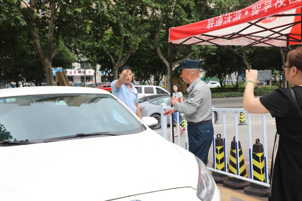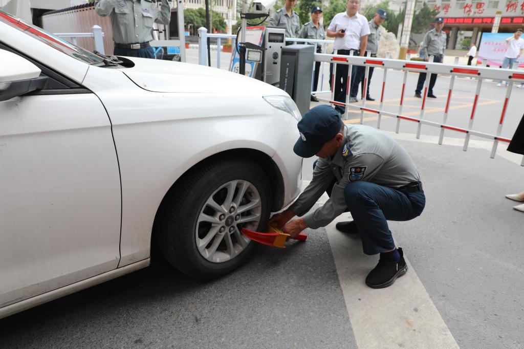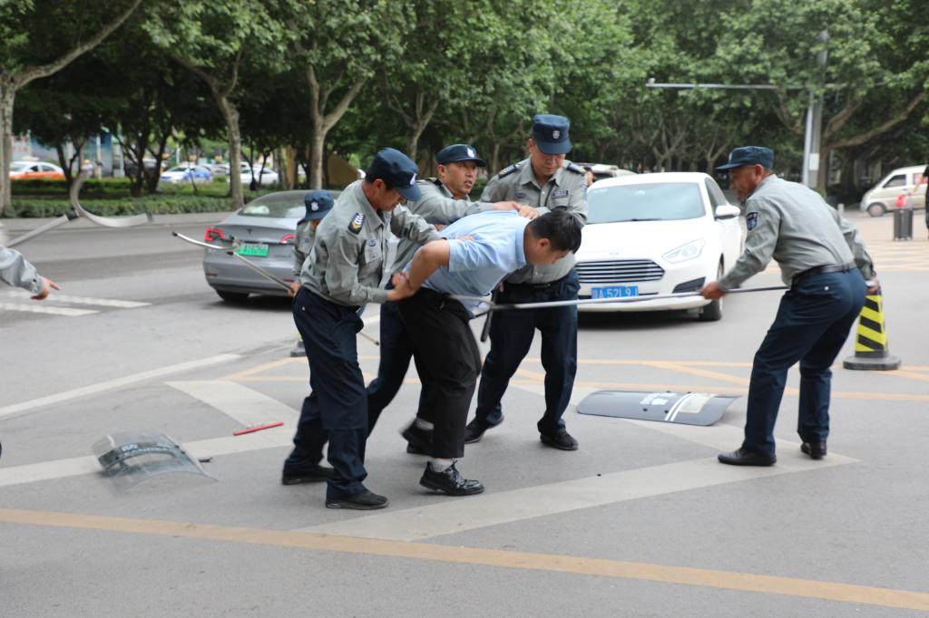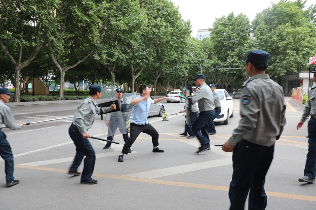 第二环节,模拟一名“暴恐分子”企图驾车冲入校园,门岗保安队员发现后立刻携带防暴装备前往支援,利用钢叉、盾牌、警棍等防暴装备迅速控制“暴徒”,并将车辆锁停,同时打开应急通道,恢复大门区域正常出入秩序。