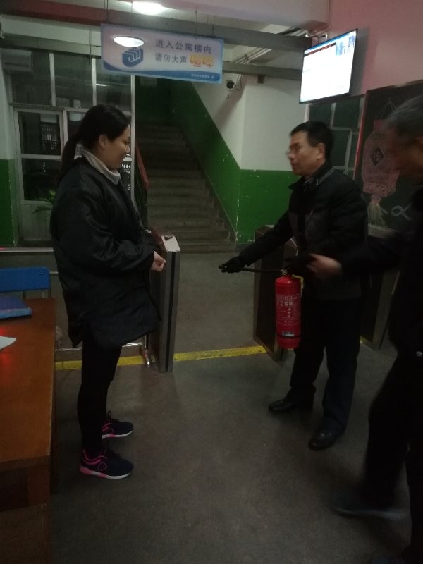 | 郭宝东向学生公寓管理人员介绍灭火器操作使用方法 |